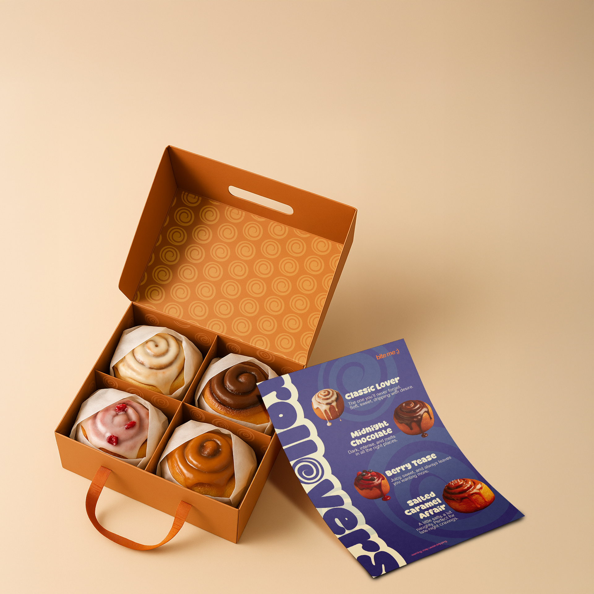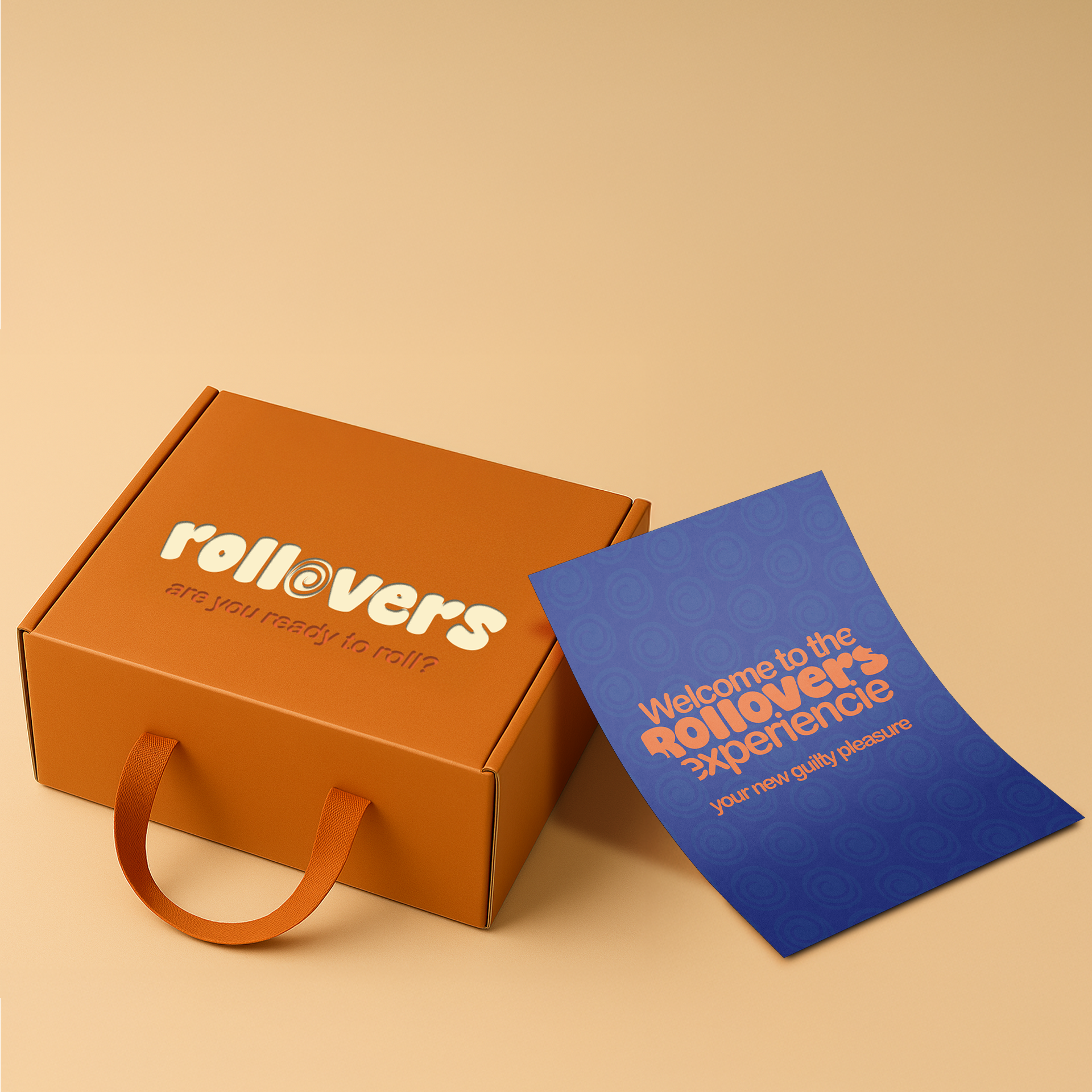 Storytelling pieces: A welcome card invites recipients to the Rollovers Xperience—your new guilty pleasure—while a flavor menu introduces the four indulgent varieties: Classic Lover, Midnight Chocolate, Berry Tease, and Salted Caramel Affair.